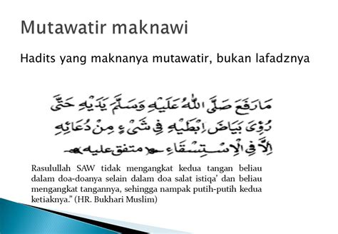 2.Mutawatir Ma’nawy adalah maknanya yang mutawatir sedangkan lafadhnya tidak. Misalnya, hadits-hadits tentang mengangkat tangan ketika berdoa. Hadits ini telah diriwayatkan dari Nabi sekitar 100 macam hadits tentang mengangkat tangan ketika berdo’a. Dan setiap hadits tersebut berbeda kasusnya dari hadits yang lain. Sedangkan setiap kasus belum mencapai derajat mutawatir. Namun bisa menjadi mutawatir karena adanya beberapa jalan dan persamaan antara hadits-hadits tersebut, yaitu tentang mengangkat tangan ketika berdo’a. [lihat Mabaahits fii ‘Uluumil-Hadiits oleh Manna’ Al-Qaththan, Maktabah Wahbah,